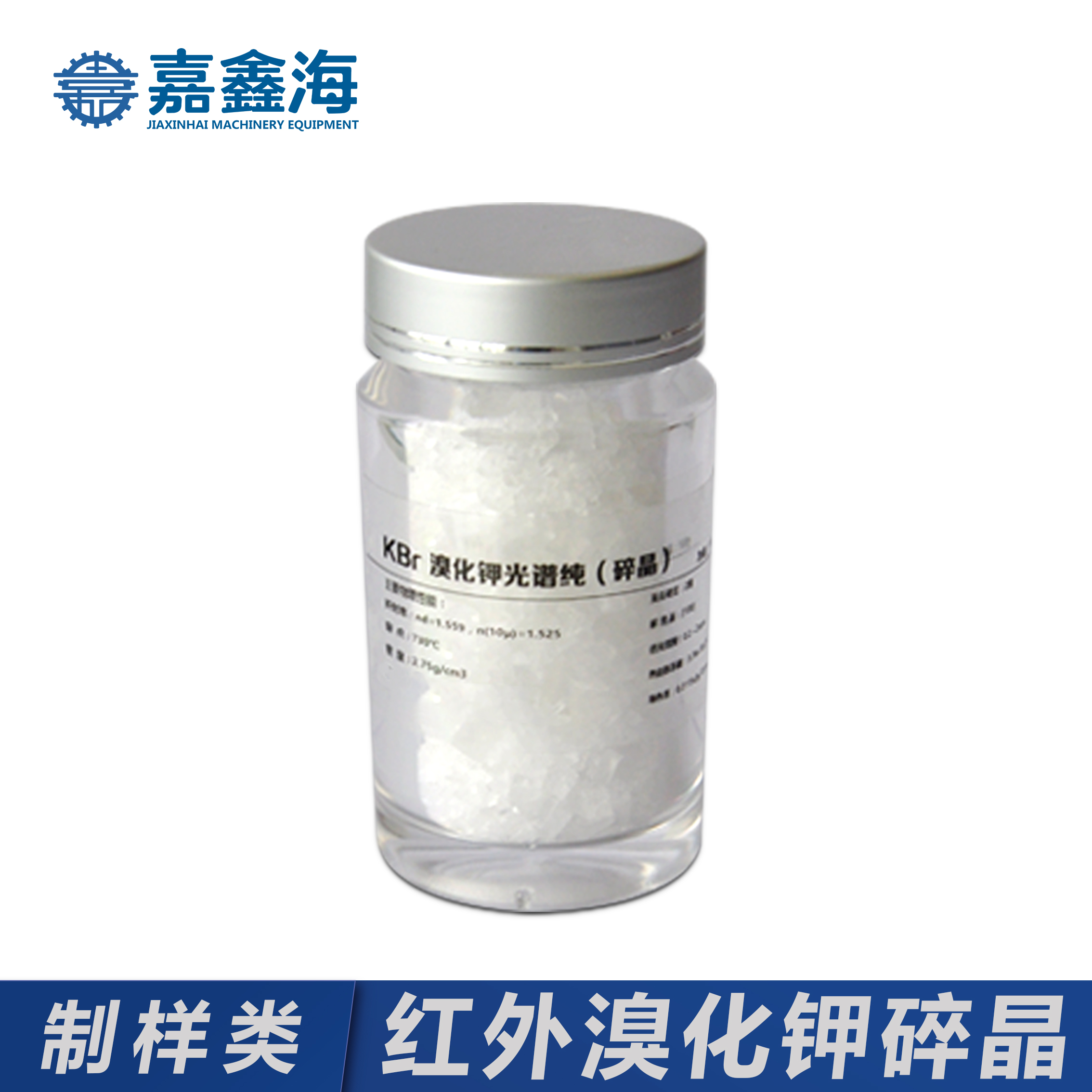 - 嘉鑫海50克光譜純級Kbr碎晶是白色結晶或粉末。無嗅、味咸、微苦。見光易變黃。密度2.75g/cm3。熔點734℃。沸點1435℃。溶于水和甘油,水溶液呈中性,微溶于乙醇。有吸濕性。