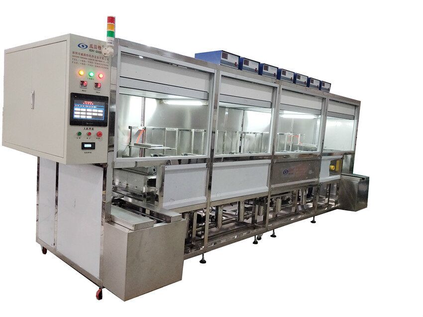 一、設(shè)備簡介 1、設(shè)備名稱:半自動(dòng)九槽式超聲波反光杯清洗機(jī) 2、設(shè)備型號(hào):VGT-907FTH 3、清洗要求:無白點(diǎn)、表面無污、脫水 4、清洗節(jié)拍:約4~5分鐘/籃 二、工藝流程 ①超聲波溶劑清洗——②超聲波水溶劑清洗——③噴淋漂洗——④超聲波熱純水漂洗——⑤超聲波熱純水漂洗——⑥超聲波熱純水漂洗——⑦超聲波熱純水漂洗——⑧熱純水慢拉脫水洗——⑨熱風(fēng)干燥(提籃方式:手動(dòng)) 三、設(shè)備的組成部分 該半自動(dòng)洗凈機(jī)主要由超音波發(fā)生器、振動(dòng)器、清洗子槽、清洗母槽、不銹鋼循環(huán)過濾系統(tǒng)、自動(dòng)溫控加熱系統(tǒng)、純水脫水槽、升降裝置、搖擺裝置,機(jī)架,和電配控制系統(tǒng)等組成。 四、清洗原理 當(dāng)超聲波電源將市電轉(zhuǎn)換成交流電信號(hào)之后,會(huì)將這一信號(hào)有效的傳輸給安裝在超聲波清洗槽底部的超聲波振子,超聲波振子會(huì)將信號(hào)轉(zhuǎn)換成高頻振動(dòng)機(jī)械能。振動(dòng)能回穿透不銹鋼板直接傳遞到清洗溶液中,并逐漸產(chǎn)生無數(shù)個(gè)微小氣泡,這些小氣泡又會(huì)慢慢的膨脹,直至破裂并瞬間產(chǎn)生能量巨大的沖擊波使反光杯上的指紋、粉塵等污漬徹底清洗干凈,然后將這些污染物充分的溶解于水基清洗劑中。 五、超聲波清洗機(jī)的主要材料 威固特超聲波清洗設(shè)備的機(jī)身主要由優(yōu)質(zhì)的304不銹鋼板制成,因?yàn)樵摬牧喜粌H具有高度防氧化功能,還具有極強(qiáng)的防腐蝕性功能,能夠承受較高的堿溶液腐蝕。