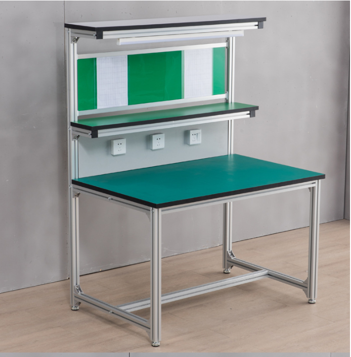 尺寸:長1500*寬750*高800mm 桌板:50mm厚度高壓合成板+耐沖擊膠皮 桌腳:100*50*1.5mm C型鋼,桌腳上有預留2個插板孔。 抽屜:配置豎向兩個抽屜每抽承重40-50公斤 工作臺采用優質冷軋板精工制作而成,堅固的工作桌框架,牢固平穩,可使工作臺承重1000公斤。 工作臺可配合掛板、上架、掛鉤及電器配件,配合各種不同用途之測試桌,并可依據客戶之需求設計;打造特殊用途之工作臺,有效提高工作效率。 臺面耐沖擊、耐酸堿、耐油、耐磨、可直接開孔安裝臺虎鉗等小型加工機械。 桌架全拆裝結構,全國各地均可發貨,可為您及公司節省更多成本,組裝方便。