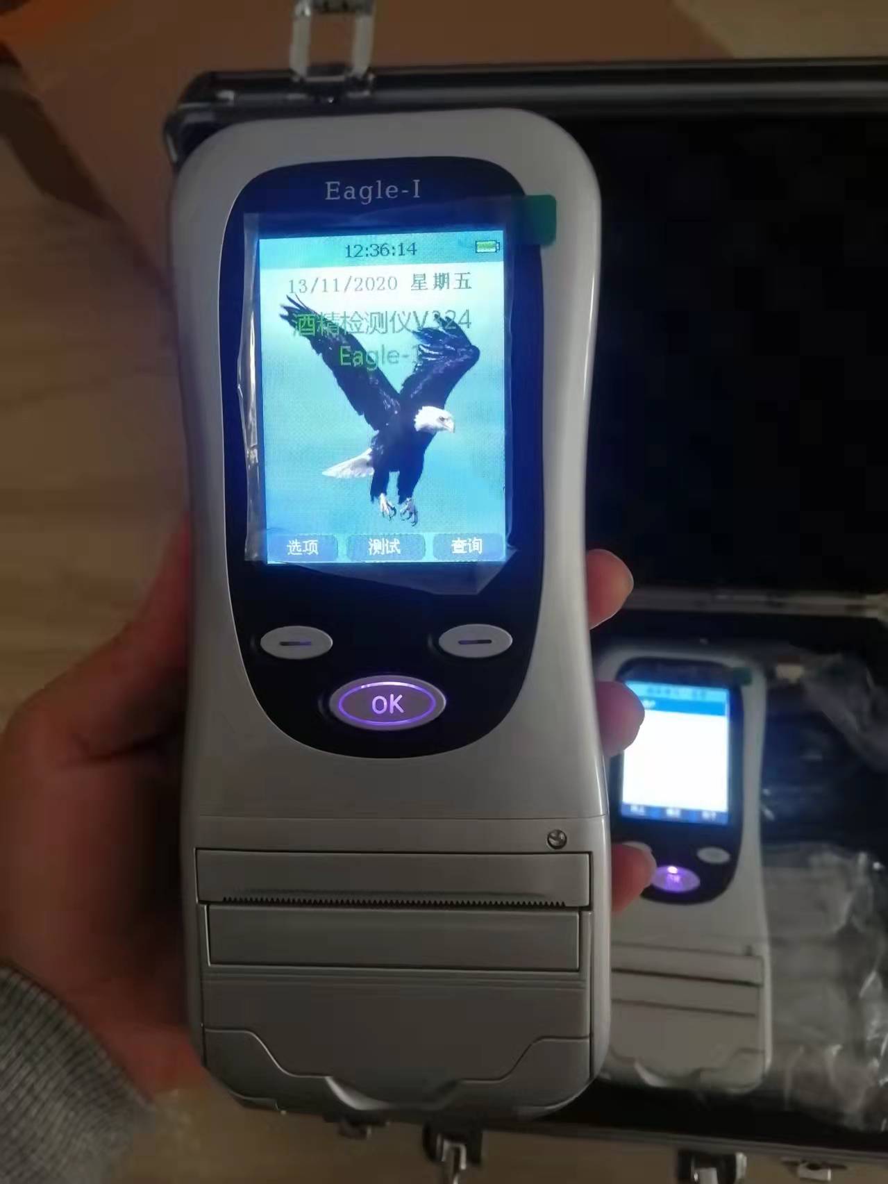 天鷹一號(hào)eagle-i酒精檢測(cè)儀主機(jī)采用處理能力32位嵌入式處理器、使得測(cè)試速度提高,而且兩次測(cè)試之間的間歇明顯縮短;打印機(jī)與主機(jī)聯(lián)成一體,測(cè)試完成后立即打印結(jié)果。