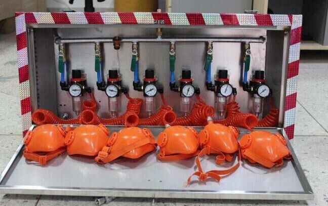 AYH-1A壓風自救器一般形成系統后使用,即由若干組壓風自救裝置安裝在同一個地點形成壓風自救站,每組一般由3~5個頭組成,每個地點裝多少個頭,應視該工作場所的工作人數而定,其安裝頭數應大于在該場所工作的人數。該裝置系統結構簡單,價格便宜,是一種經濟型性自救裝置系統。 作原理:裝置由管道、開閉閥、連接管、減壓組及防護套等5部分組成。當煤礦井下發生瓦斯濃度超標或超標征兆時,扳動開閉閥體的手把氣路通暢,功能裝置迅速完成泄水、過濾、減壓和消音等動作后,此時防護套內充滿新鮮空氣供避災人員救生呼吸。防護套內的空氣壓力為(0.05~0.1)Mpa,防護套外有毒氣體的壓力低于套內壓力,因此外部有害氣體不會進入防護套內對避災人員造成危害。