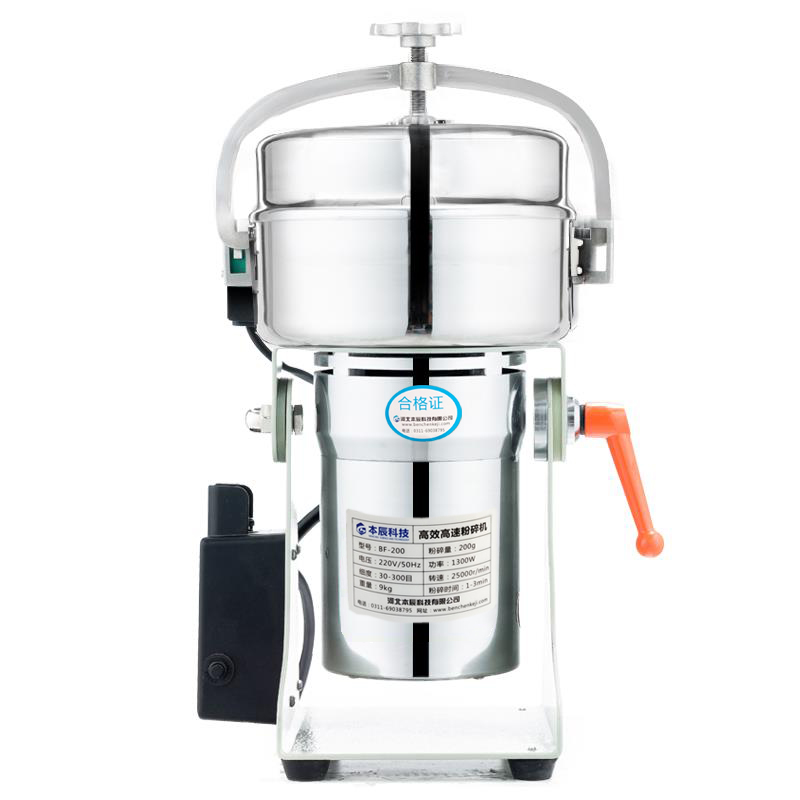 本機安裝無特殊要求。打開包裝箱取出本機,置放平穩,將隨機配置的電源線一端插入機器電源的插孔內,另一端插入交流220V的電源插座上。電源插座上應有保護接地裝置。打開上蓋倒入需粉碎的物料(物料含糖含油量不能超過15%,含糖含油量高的物料可混合干性物料粉碎),一次粉碎量不超過粉碎室容量的一半,蓋上蓋鎖緊弓形卡扣,開機運行。一般中藥粉碎成粉不超過30秒,顆塊三七粉碎(200目細度)只需30秒,60秒即可將珍珠粉成類似白面粉。斷電,打開上蓋倒出物料即可。若細度不夠可延長粉碎時間,但最長不會超過三分鐘。或將物料過篩,粗粉繼續粉碎,即可得到均勻細粉。
