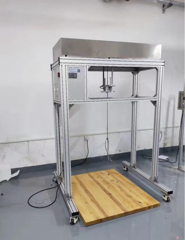 功能概述:驅動機構驅動頂桿使支承木板上升至預定高度,突然高速落下(下落加速度為9.8),支承木板自由跌落至木質平臺上。該機配護欄及高位攔桿,用以防止試驗過程中產品傾倒及震落到試驗臺外。