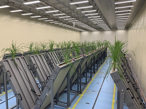• 簡介 實驗室桁架植物表型平臺是一種在溫室或人工氣候室中,利用可移動桁架,搭載一種或多種表型信息獲取模塊,可以全自動、高通量獲取大量中小型植株表型信息的植物表型平臺系統。桁架搭載成像系統達到植物樣品上方進行拍攝,植物樣本在整個測量過程中不必移動,減少外界因素對植物生長的干擾。 系統組成 桁架式行走裝置: 可搭載成像系統,使成像系統可移動至所需測量的植物樣本上方,對植物樣本進行表型數據采集。 成像系統: 成像系統中包含可見光相機、多光譜/高光譜相機、熱紅外相機、激光掃描儀等表型測量設備,補光鹵素燈,工控機控制系統等子系統。 軟件分析系統: 軟件分析系統中包含成像設備控制系統、數據采集與存儲系統、數據分析系統、數據統計與可視化展示系統、報警監(jiān)控系統等。 系統功能 可見光成像: 可獲取單株投影面積、單株葉片數量、單株投影周長、單株投影凸包長/短軸等植物單株表型信息。測量精度±5mm。 可獲取單葉片面積、單葉片周長、單葉片凸包長/短軸、單葉片顏色比例分析等植物葉片表型信息。測量精度±5mm。 可獲取植物可見光顏色構成比例、單株生長歷程回放等植物生長狀態(tài)信息。 多光譜/高光譜成像: 可獲取歸一化指數(NDVI)、簡單比值指數(SR)、最優(yōu)化土壤調整植被指數(OSAVI)、綠度指數(G)、比值植被指數(RVI)、差值環(huán)境植被指數(DVIEVI)、綠光歸一化差值植被指數(GNDVI)等植被指數信息。 改進的葉綠素吸收反射指數(MCARI)、改進的葉綠素吸收反射指數(1MCARI1)轉換類胡羅卜素指數(TCARI)、三角植被指數(TVI)、ZMI指數、簡單比值色素指數(SRPI)、歸一化脫鎂作用指數(NPQI)、光化學植被反射指數(PRI)、歸一化葉綠素指數(NPCI)Carter指數、SIPI指數、Gitelson-Merzlyak指數、花青素反射指數1。 可獲取植物含水量、植物含氮量、植物葉綠素含量等植物生理指標信息。 熱紅外成像: 可獲取植物表面溫度信息與溫度分布情況信息,進而分析植物蒸騰等問題。 激光掃描成像: 可獲取植物3D點云模型,進而獲取植物高度、3D葉面積、投影葉面積、數字生物量、葉片角度、葉面積指數、葉片覆蓋率等植物株型信息。 型號分類 根據植物種植區(qū)不同,實驗室桁架植物表型平臺可分為苗床型與培養(yǎng)架型。 苗床型 苗床型植物表型平臺采用單層苗床作為植物種植區(qū),適用于中型植物,如水稻、小麥的全生長期表型信息獲取。選用苗床作為植物生長區(qū),同等空間可種植植物樣品數量少,空間利用率較低。苗床型植物表型平臺在表型信息獲取過程中基本上無需人工干預。 培養(yǎng)架型 培養(yǎng)架植物表型平臺采用培養(yǎng)架作為植物種植區(qū),適用于擬南芥等小型植物,與水稻幼苗、小麥幼苗等中型植物幼苗的表型信息獲取。選用培養(yǎng)架作為植物生長區(qū),同等空間可種植植物樣品數量多,空間利用率更高。培養(yǎng)架植物表型平臺在表型信息獲取過程中需要人工抽拉培養(yǎng)架層板。
