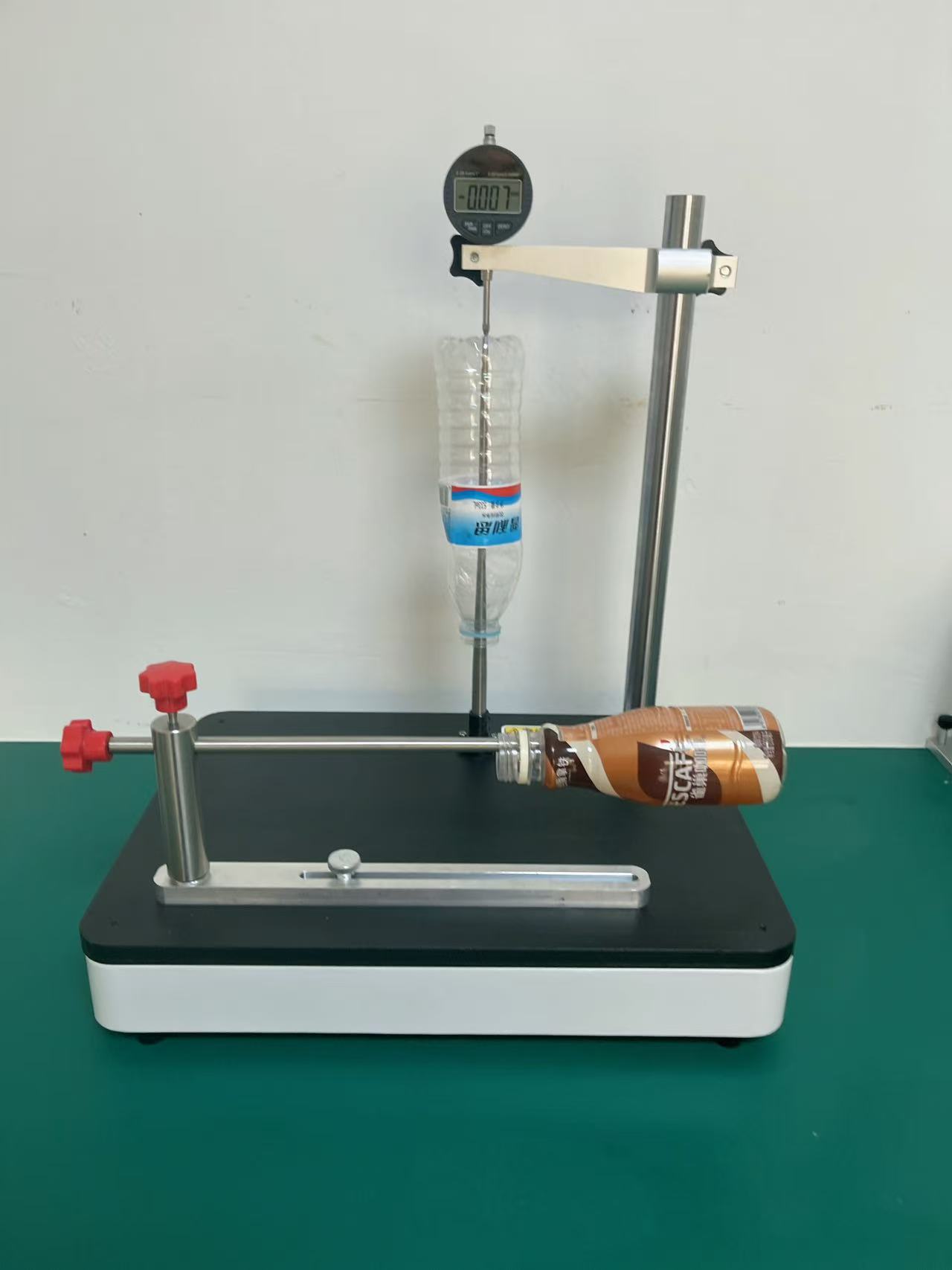 3. 提起千分表帽,將試樣從瓶口套入進測量桿,待千分表當前值顯示數值穩定后,記錄顯示數據。