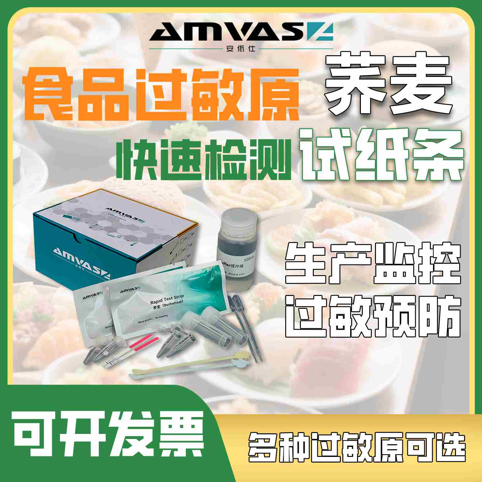 - 食品過敏原快速檢測試紙條運用免疫原理和膠體金層析技術,產品具有專一性強、敏感度高、檢測快速等特點。可用于檢測可用于檢測未知成分或標識不清的加工產品。不僅能檢測出食品中痕量過敏原,也可運用于食品加工過程中的質量管控,如進料、生產過程及成品檢測。AMVAS助力企業過敏原風險監控,提供多種過敏原檢測產品與樣品檢測服務。