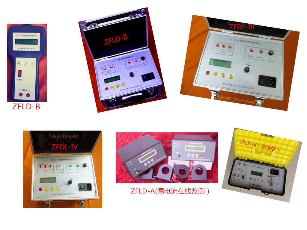 ZFLD-B型: 表型電漏電保護器測試儀。測試漏電電流15mA、30mA 、60mA、90mA ,120 mA、200mA, 300mA, 500mA ;測量時間:0—9999mS;時間分辯率:1ms;既可帶電測試亦可不帶電測試;