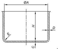 歐洲燃氣灶熱效率測試鍋如上圖所示。(A為頂部量得的內徑、H為內部深度、C為底面厚度、D為側壁厚度、E為內角半徑)