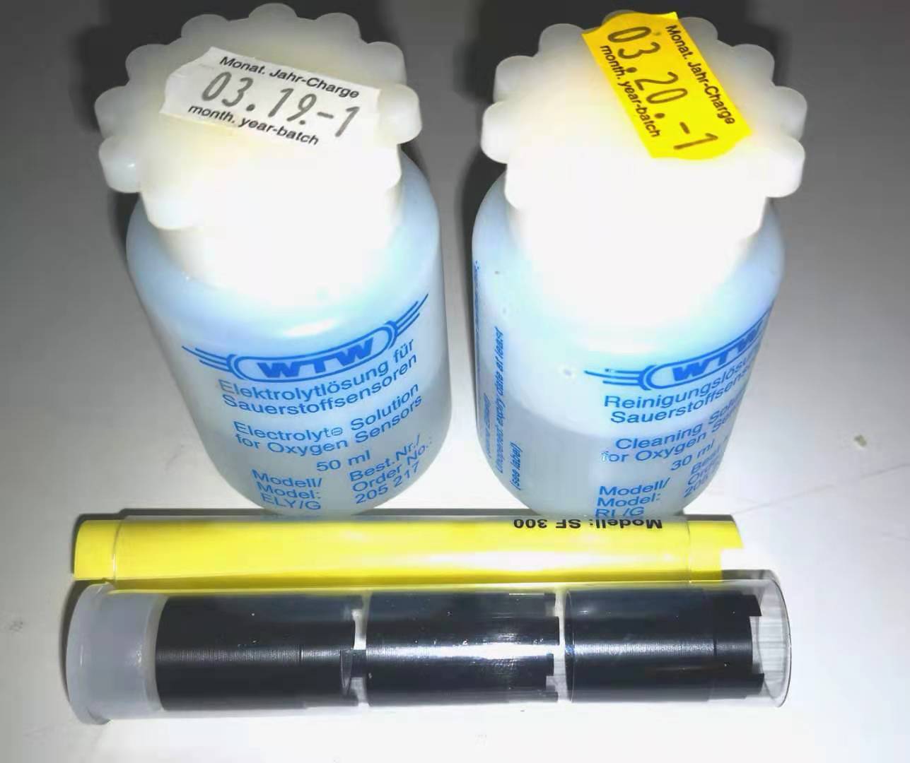 一套ZBK325耗材,包含:三個溶氧電極膜頭,一瓶電解液,一瓶清洗液,一個研磨紙.