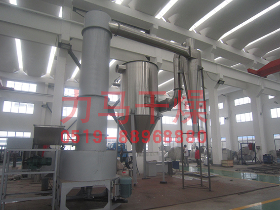 熱空氣由主機底部進風口切向進入閃蒸干燥機主塔、在閃蒸干燥機主塔內形成螺旋形的上升高速旋轉氣流,同時根據不同的物料性質調整底部環隙大小,使風速處于最佳合適的狀態。物料經螺旋加料器直接進入閃蒸干燥塔,在高速氣流的沖擊和帶動下,迅速分散并隨氣流作高速旋轉運動。對于比較大且潮濕的顆粒團,高速氣流不足以使之破碎并高速旋轉,于是在重力作用下逐漸下落,當落到主機底部時被設置在底部的破碎裝置強行破碎并微粒化,然后隨高速氣流一并旋轉上升而完成干燥過程。為了使物料的終水分達到極低同時不受初水分的波動而影響產品質量,在干燥塔內設置多層旋流片,形成較為穩定的流態化床,同時旋流片亦起到保證干燥所必須的停留時間和分級的作用。
