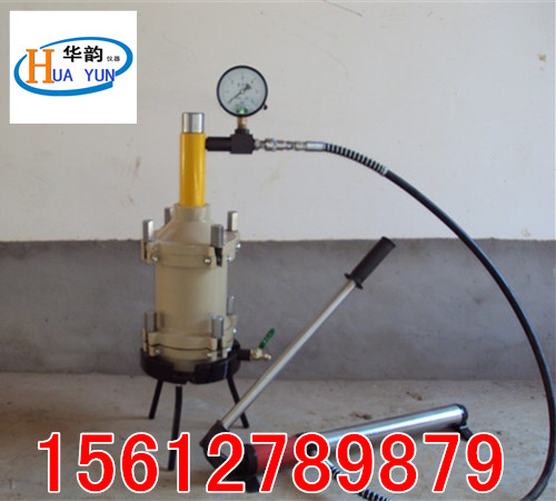 1、打開上蓋,將需要測試的砼拌合物裝入試料筒內(nèi),用搗棒由外圍向中心插搗25次,加上活塞,并將活塞的出氣孔螺絲擰下,壓下活塞至剛接觸混凝土表面,擰緊出氣孔螺絲,蓋好上蓋扳緊螺母,接好手動泵與千斤頂?shù)目焖俳宇^(詳見結(jié)構(gòu)簡圖)