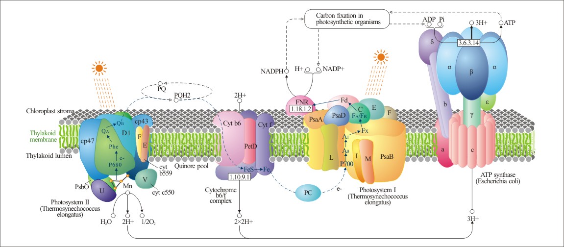PS II 是一種完整的膜蛋白,膜蛋白的核心是由兩個亞基D1和D2組成。這兩個亞基跨膜并且與細菌光系統(tǒng)的L和M亞基同源。