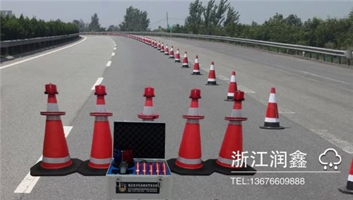 3、輛突破警戒線,碰撞安裝無線預警器的錐桶時,無線預警器立即發出無線報警信號,現場所有報警器及便攜報警器即時發出聲光報警,提醒現場工作人員注意避讓。按車速十、0公里/小時計算,根據警戒線布設的距離不同,一般可提供6~15秒預警時間。
