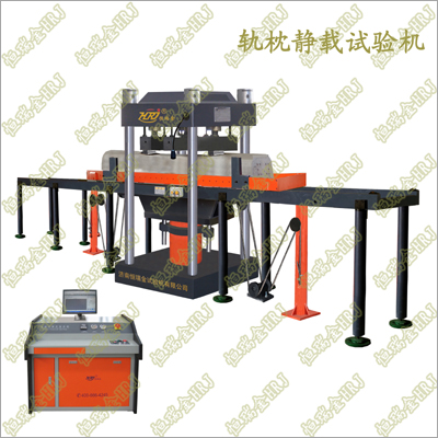 →軌枕靜載試驗機由載荷機架、移動小車、移動滑軌載架、自動頂升機構、液壓加載系統、測控系統組成。