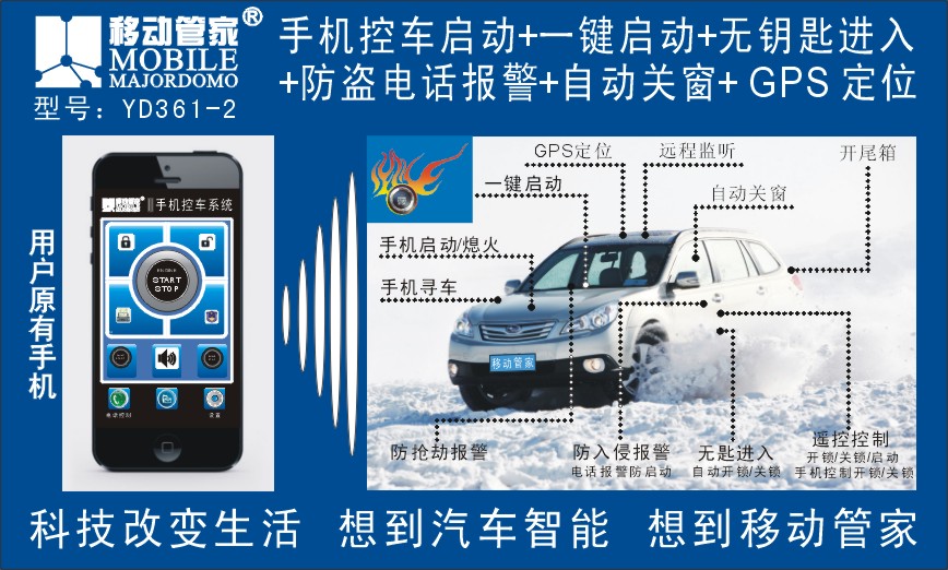 汽車智控移動管家品牌綜合遠程啟動提前手機引擎發動機,智能鑰匙一鍵啟動,時尚舒適享受坐駕冬暖夏涼,創新型智控設集,使整個控車過程式能有效地應用到引擎管理、養護、安全、車身控制、車溫控制、高級智控車等領域中。