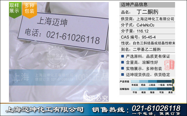 別 名:,二乙二肟,丁二肟,二甲基乙二醛肟,二甲基乙二肟,二乙酰二肟,雙乙酮肟,鎳試劑。