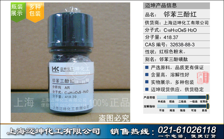 1)鄰苯三酚紅可用作鉍、鈷(II)、鎳和鉛等離子的絡合滴定指示劑;