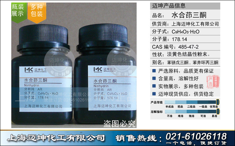 別 名:水合三酮氫茚,三酮氫茚,水合,茚三酮,水合,水合印三酮,苯并戊三酮,苯并環(huán)丙三酮,寧海群,2,2-二羥基茚-1,3-二酮。