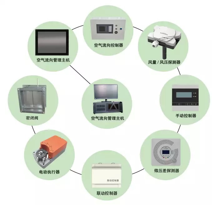 智能型空氣流向管理系統(tǒng)由T微壓差探測器、風量/風壓探測器、手動控制器、聯(lián)動控制器、電動執(zhí)行器、電動壓差動態(tài)調(diào)節(jié)閥、電動多工況定風量閥、壓差檢測器,空氣流向控制器、空氣流向管理主機及系統(tǒng)管理專用軟件等部分或全部設(shè)備組成。