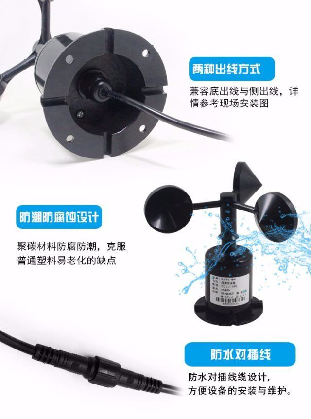 • 風(fēng)速傳感器多用于室外環(huán)境監(jiān)測(cè),所以對(duì)于其耐用性要求極其高,我司生產(chǎn)的風(fēng)速變送器是聚碳材質(zhì)外殼(類(lèi)似紅綠燈殼子材料,常用來(lái)代替金屬及其它合金),相比較市面上普通塑料材質(zhì)的風(fēng)速風(fēng)向傳感器,在其耐用性,抗沖擊力,穩(wěn)定性,耐熱耐寒性等各個(gè)方面有過(guò)之而無(wú)不及;公司根據(jù)市場(chǎng)需求獨(dú)創(chuàng)的底部出線(xiàn)方式,完全杜絕航空插頭橡膠墊老化問(wèn)題,長(zhǎng)期使用仍然防水,同一設(shè)備可同時(shí)滿(mǎn)足現(xiàn)場(chǎng)下出線(xiàn),側(cè)出線(xiàn)的安裝需求; 產(chǎn)品概述 RS-FS-*風(fēng)速變送器(脈沖型),外形小巧輕便,便于攜帶和組裝,三杯設(shè)計(jì)理念可以 有效獲得風(fēng)速信息,殼體采用聚碳酸酯復(fù)合材料,具有良好的防腐、防侵蝕等特點(diǎn),能夠保 證變送器長(zhǎng)期使用無(wú)銹琢現(xiàn)象,同時(shí)配合內(nèi)部順滑的軸承系統(tǒng),確保了信息采集的精確性。 被廣泛應(yīng)用于溫室、環(huán)境保護(hù)、氣象站、船舶、碼頭、養(yǎng)殖等環(huán)境的風(fēng)速測(cè)量。 功能特點(diǎn) ? 量程:0-60m/s,分辨率 0.125m/s ? 防電磁干擾處理 ? 采用底部出線(xiàn)方式、完全杜絕航空插頭橡膠墊老化問(wèn)題,長(zhǎng)期使用仍然防水 ? 采用高性能進(jìn)口軸承,轉(zhuǎn)動(dòng)阻力小,測(cè)量精確 ? 全鋁外殼,機(jī)械強(qiáng)度大,硬度高,耐腐蝕、不生銹可長(zhǎng)期使用于室外 ? 設(shè)備結(jié)構(gòu)及重量經(jīng)過(guò)精心設(shè)計(jì)及分配,轉(zhuǎn)動(dòng)慣量小,響應(yīng)靈敏 直流供電(默認(rèn)): 5~30V DC 變送器電路工作溫度: -20℃~+60℃,0%RH~80%RH 通信接口:485,模擬量, 脈沖輸出 分辨率 :0.0875m/s 測(cè)量范圍: 0~60m/s(量程可定制) 動(dòng)態(tài)響應(yīng)時(shí)間: ≤0.5s 啟動(dòng)風(fēng)速: ≤0.2m/s