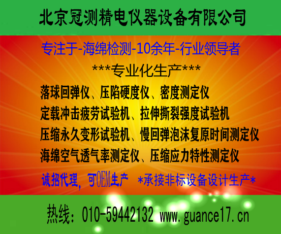 - ◆★◆【北京冠測精電儀器設(shè)備有限公司】官網(wǎng) www.guance17.cn 電話:010-57223837 57223838 57223839 57223836◆★◆海綿密度測試、海綿泡綿密度計(jì)、GB/T 6343-2009 泡沫塑料及橡膠 表觀密度的測定、GB/T 21333-2008 硬質(zhì)泡沫塑料 自結(jié)皮高密度材料試驗(yàn)方法、泡棉壓陷硬度測試儀、海綿切割設(shè)備、海綿往復(fù)沖擊疲勞試驗(yàn)機(jī)、慢回彈泡沫復(fù)原時(shí)間測定儀、泡棉壓縮應(yīng)力試驗(yàn)機(jī)、慢回彈海綿復(fù)原時(shí)間測定儀、