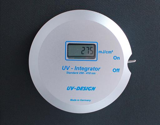 b.將能量計放置于UV燈燈源附近,盡量做到以其背面對準燈源(因能量計的能量感受器在背面),照射時間作適當延長。