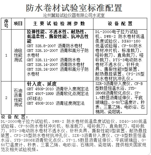 設備配置:DL-2000電子拉力試驗機、DWR-2 防水卷材低溫柔度試驗儀、DX40-160低溫試驗箱、CP-50防水卷材沖片機、標準裁刀、啞鈴裁刀、直角裁刀、啞鈴裁刀、DTS-3電動防水卷材不透水儀、針桿夾具、撕裂性能U型裝置、耐熱懸掛裝置、CPS-25型防水卷材抗沖孔儀、SZR-3瀝青針入度儀、CF-B型數顯恒溫水浴、SYD-2806E瀝青軟化點儀、SY-1.5數顯瀝青延伸儀、平底玻璃皿、0-50℃溫度計、秒表、三氯乙烯、電砂浴、石棉網、瓷坩堝。提供相關國家規范及相關試驗視頻。 www.010-17.com,另備有:防水卷材不透水儀、防水卷材測厚儀、防水卷材沖片機、防水卷材低溫柔度試驗儀、防水卷材抗沖孔儀、防水卷材彎折儀、防水卷材真空吸水儀、防水卷材試驗室標準配置、針型測厚儀、板式測厚儀、低溫試驗箱、客服QQ:102434501 手機:13803170820 http://www.0471.cn