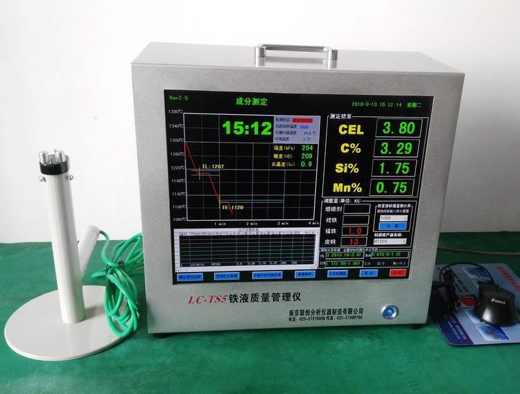 用于爐前快速測定灰鑄鐵和球墨鑄鐵鐵水的碳當量CE%、碳含量C%、硅含量Si%、球化率SG%等鐵水性能;預測普通灰鑄鐵的抗拉強度等。非專業人員經簡單培訓即可操作;在鐵水可等待的時間內完成檢測,然后根據自動計算出的增碳劑、硅鐵、廢鋼投放量對鐵水成份進行調整,有效的指導生產實踐。