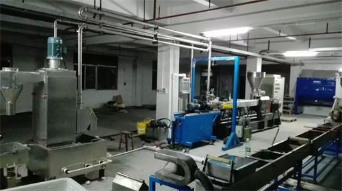 本機組小型打樣造粒機針對基本配方為導電黑母粒,20%粉料+80%粒料混合下料造粒。物料性能要求機組操作溫度約在350℃,本機組可耐高溫約為500℃。螺桿及筒體采取表層鍍硬鉻處理,具有抗腐蝕性,耐高溫性,產(chǎn)能約在3-8公斤/小時.
