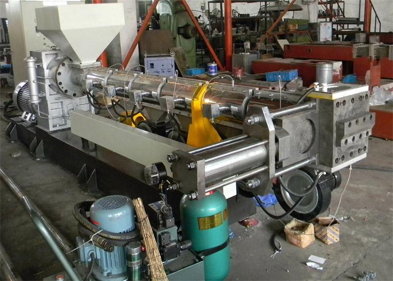 主機由交流電機、聯軸器、減速分配箱、潤滑油系統、喂料系統、筒體及螺桿、加熱系統、抽真空系統、軟水系統、冷切模頭和機身等組成。