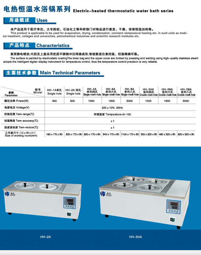用途概述: 廣泛用于醫(yī)療單位、大專院校、科研部門和生產(chǎn)單位進(jìn)行蒸發(fā)、干燥、濃縮、恒溫加熱試品之用。 產(chǎn)品特點(diǎn): 表面采用靜電噴涂工藝,內(nèi)膽、上蓋均采用不銹鋼板制作,抗腐蝕,可選擇指針或數(shù)顯儀表控溫,控溫精度高,性能穩(wěn)定。 主要技術(shù)參數(shù) 型號(hào) DZKW-D-1 DZKW-D-2 DZKW-D-4 DZKW-D-6 DZKW-S-4 DZKW-S-6 DZKW-S-8 規(guī)格 單孔 雙孔 單列四孔 單列六孔 雙列四孔 雙列六孔 雙列八孔 額定功率(w) 300 500 1000 1500 1000 1500 2000 工作電壓(V) 220V/50Hz 220V/50Hz 220V/50Hz 220V/50Hz 220V/50Hz 220V/50Hz 220V/50Hz 溫度均勻度(℃) ≤±1 ≤±1 ≤±1 ≤±1 ≤±1 ≤±1 ≤±1 溫度波動(dòng)度(℃) ≤±1 ≤±1 ≤±1 ≤±1 ≤±1 ≤±1 ≤±1 控溫范圍(℃) RT+10-100 RT+10-101 RT+10-102 RT+10-103 RT+10-104 RT+10-105 RT+10-106 控溫靈敏度(℃) ≤±1 ≤±1 ≤±1 ≤±1 ≤±1 ≤±1 ≤±1 示值誤差(℃) ≤±2 ≤±2 ≤±2 ≤±2 ≤±2 ≤±2 ≤±2 工作室尺寸(mm) 160x170x90 325x170x90 650x170x90 940x170x90 325x330x90 480x330x90 650x330x90