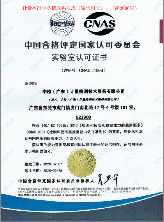 ? 中檢(廣東)計量檢測技術服務有限公司成立于2004年6月,系經中國合格評定國家認可委員會(CNAS)認可的校準實驗室。具有獨立法人資格的第三方檢測機構。校準范圍覆蓋電學 、無線電 、長度 、 力學 、溫度、理化、光學、環境等多項專業領域。CNAS認可證書編號為L1868,合計認可項目超500多項。所出具的證書和檢測報告得到廣大客戶和國際實驗室的認可。