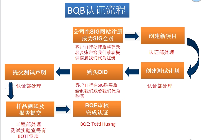 BQE (藍牙資格認證專家): BQE 是由藍牙技術(shù)聯(lián)盟認可進行藍牙資格認證的藍牙專家。 BQE 為你定義藍牙資格認證測試計劃,審核藍牙資格認證合規(guī)性文件,批準藍牙資格認證項目并將你的產(chǎn)品列在合格設(shè)計/產(chǎn)品列表中。AGC的黃強先生(Totti Huang)是中國大陸第一位BQEAST(經(jīng)認可為藍牙技術(shù)培訓(xùn)師和藍牙強制程序稽核員的BQE)。 Totti Huang連續(xù)6年(2008 to 2013)被評為SIG TOP10BQE。