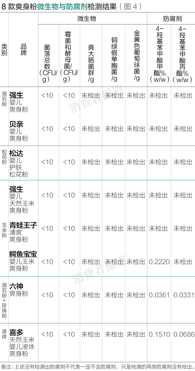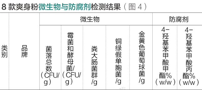 8款產(chǎn)品的衛(wèi)生狀況與防腐劑含量測(cè)試結(jié)果顯示,各類爽身粉微生物指標(biāo)表現(xiàn)良好,鱷魚(yú)寶寶、喜多的防腐劑含量相對(duì)更高。(如圖4)(點(diǎn)擊查看大圖)