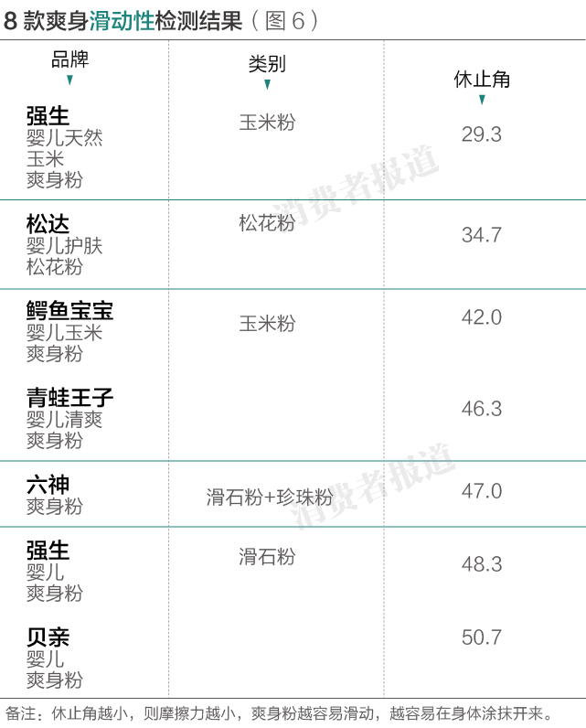 本刊此次測(cè)試8款粉體爽身粉的休止角可以反映產(chǎn)品的“滑動(dòng)”性能。測(cè)試結(jié)果顯示,強(qiáng)生玉米爽身粉與松達(dá)表現(xiàn)較佳。總體而言,玉米粉等植物淀粉比滑石粉類爽身粉的滑動(dòng)性好。(如圖6)(點(diǎn)擊查看大圖)