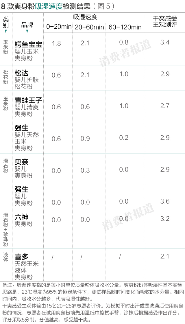 測(cè)試結(jié)果顯示,鱷魚(yú)寶寶吸濕效果更好,其次是松達(dá)。7款粉體產(chǎn)品中,不同類別爽身粉的吸濕性也有差異,玉米粉和松花粉植物淀粉吸濕性較滑石粉以及珍珠粉的要好。(如圖5)(點(diǎn)擊查看大圖)