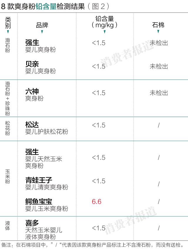 2016年5月,強(qiáng)生、貝親、六神、松達(dá)、鱷魚(yú)寶寶、青蛙王子、喜多等7品牌8款爽身粉送往權(quán)威檢測(cè)機(jī)構(gòu)進(jìn)行檢測(cè),涵蓋了滑石粉、珍珠粉、松花粉、玉米粉、液體型等5種不同類別的爽身粉,對(duì)比測(cè)試其有害成份石棉、鉛含量。
