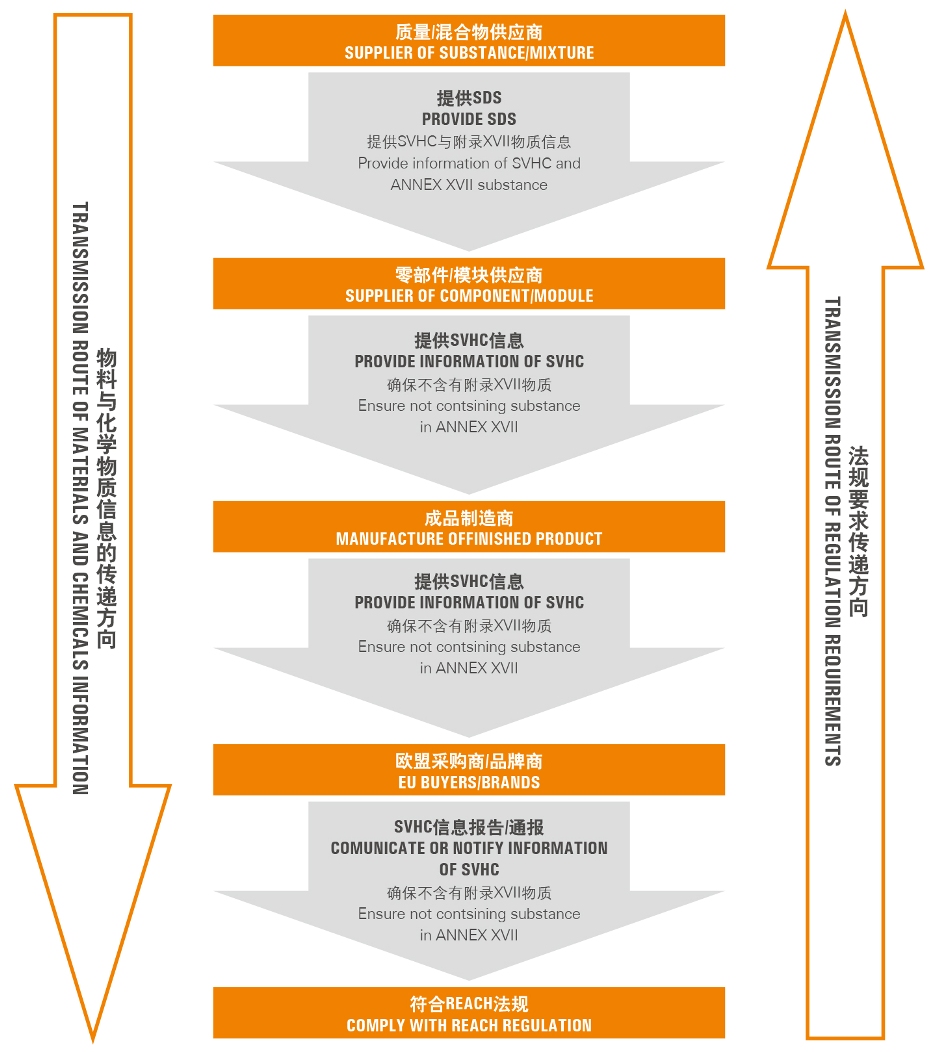 作為“物品”類產品,出口到歐盟的電子電氣產品需重點考慮REACH對高關注物質(SVHC)和附錄XVII物質(限制物質)的管理要求。而企業在供應鏈中的角色不同,其應對REACH法規的方式也會有所區別(見下圖)。