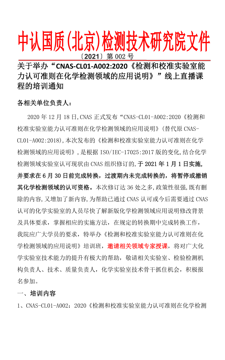 關于舉辦“CNAS-CL01-A002:2020《檢測和校準實驗室能力認可準則在化學檢測領域的應用說明》”線上直播課程的培訓通知